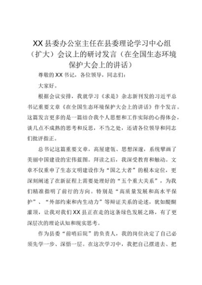 【七哥公文】2025年:XX县委办公室主任在县委理论学习中心组(扩大)会议上的研讨发言(在全国生态环境保护大会上的讲话)+更多免费公文+VX:QiGeGongWen2024