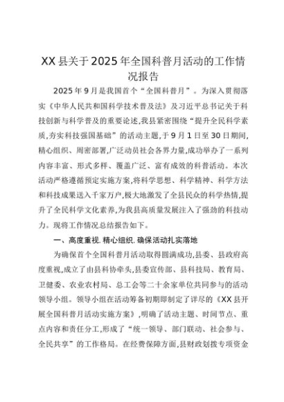 【七哥公文】2025年:XX县关于2025年全国科普月活动的工作情况报告+更多免费公文+VX:QiGeGongWen2024