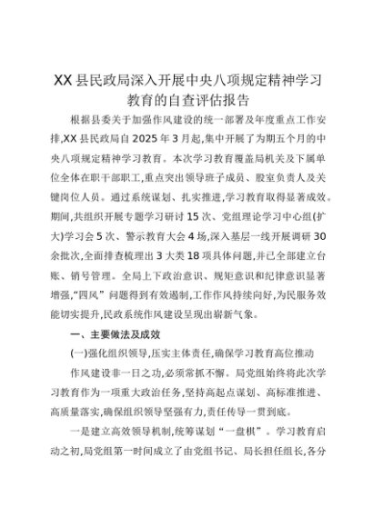 【七哥公文】2025年:XX县民政局深入开展中央八项规定精神学习教育的自查评估报告+更多免费公文+VX:QiGeGongWen2024