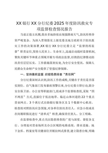 【七哥公文】2025年:XX银行XX分行纪委2025年度防汛救灾专项监督检查情况报告+更多免费公文+VX:QiGeGongWen2024