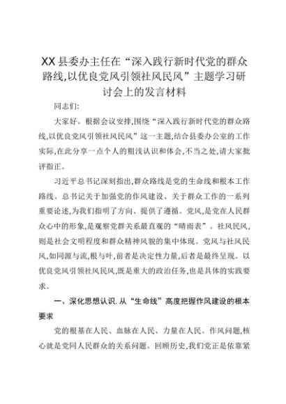【七哥公文】2025年:XX县委办主任在“深入践行新时代党的群众路线,以优良党风引领社风民风”主题学习研讨会上的发言材料+更多免费公文+VX:QiGeGongWen2024