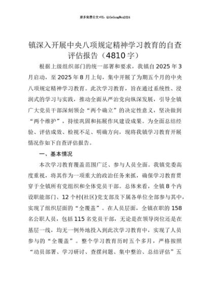 【七哥公文】2025年:【七哥公文】镇深入开展中央八项规定精神学习教育的自查评估报告(4810字)+更多免费公文+VX:QiGeGongWen2024+更多免费公文+VX:QiGeGongWen2024