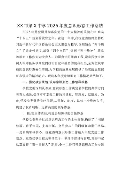 / 【七哥公文】2025年:XX市第X中学2025年度意识形态工作总结+更多免费公文+VX:QiGeGongWen2024