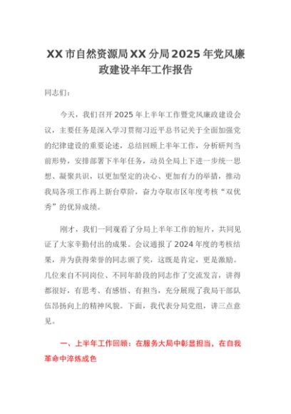 【七哥公文】2025年:XX市自然资源局XX分局2025年党风廉政建设半年工作报告+更多免费公文+VX:QiGeGongWen2024