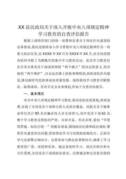 【七哥公文】2025年:XX县民政局关于深入开展中央八项规定精神学习教育的自查评估报告+更多免费公文+VX:QiGeGongWen2024