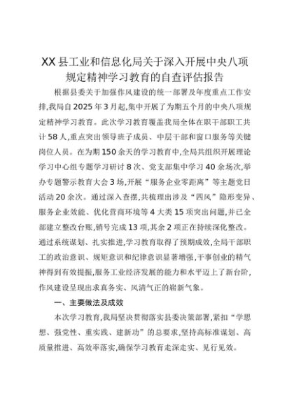 【七哥公文】2025年:XX县工业和信息化局关于深入开展中央八项规定精神学习教育的自查评估报告+更多免费公文+VX:QiGeGongWen2024