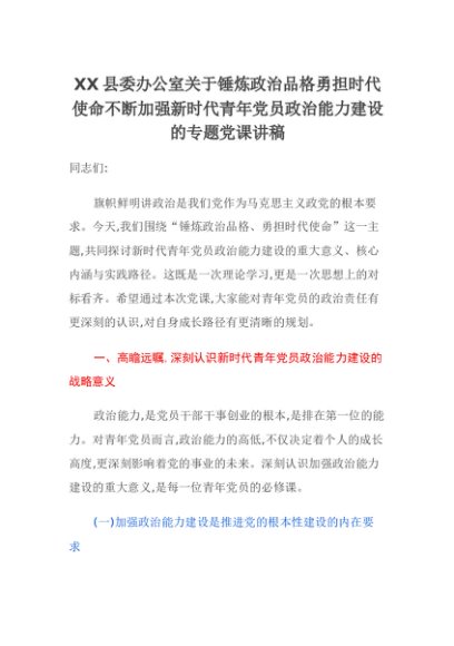 【七哥公文】2025年:XX县委办公室关于锤炼政治品格勇担时代使命不断加强新时代青年党员政治能力建设的专题党课讲稿+更多免费公文+VX:QiGeGongWen2024