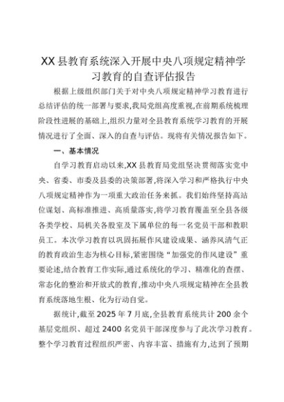 【七哥公文】2025年:XX县教育系统深入开展中央八项规定精神学习教育的自查评估报告+更多免费公文+VX:QiGeGongWen2024