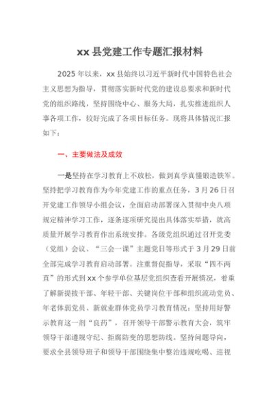 / 【七哥公文】2025年:xx县党建工作专题汇报材料+更多免费公文+VX:QiGeGongWen2024