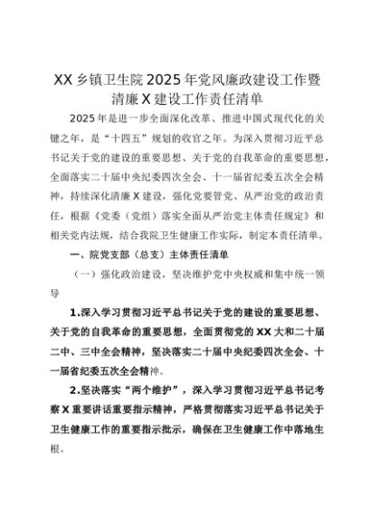 【七哥公文】2025年:XX乡镇卫生院2025年党风廉政建设工作暨清廉X建设工作责任清单+更多免费公文+VX:QiGeGongWen2024