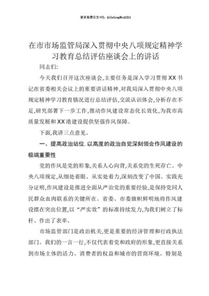 【七哥公文】2025年:【七哥公文】在市市场监管局深入贯彻中央八项规定精神学习教育总结评估座谈会上的讲话+更多免费公文+VX:QiGeGongWen2024+更多免费公文+VX:QiGeGongWen2024