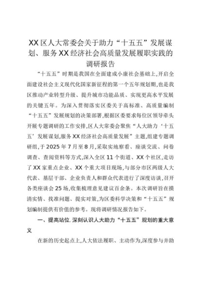 【七哥公文】2025年:XX区人大常委会关于助力“十五五”发展谋划、服务XX经济社会高质量发展履职实践的调研报告+更多免费公文+VX:QiGeGongWen2024