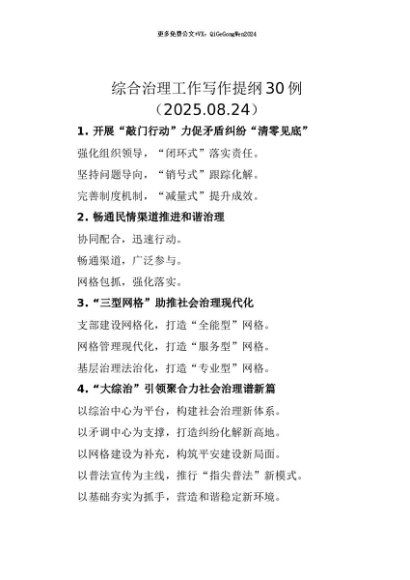 【七哥公文】2025年:【七哥公文】综合治理工作写作提纲30例(2025.08.24)+更多免费公文+VX:QiGeGongWen2024+更多免费公文+VX:QiGeGongWen2024