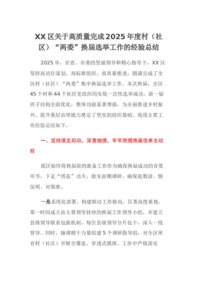 【七哥公文】2025年:XX区关于高质量完成2025年度村(社区)“两委”换届选举工作的经验总结+更多免费公文+VX:QiGeGongWen2024