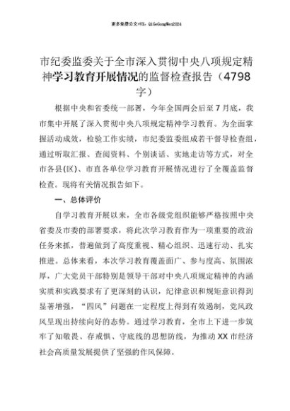 【七哥公文】2025年:【七哥公文】市纪委监委关于全市深入贯彻中央八项规定精神学习教育开展情况的监督检查报告(4798字)+更多免费公文+VX:QiGeGongWen2024+更多免费公文+VX:QiGeGongWen2024