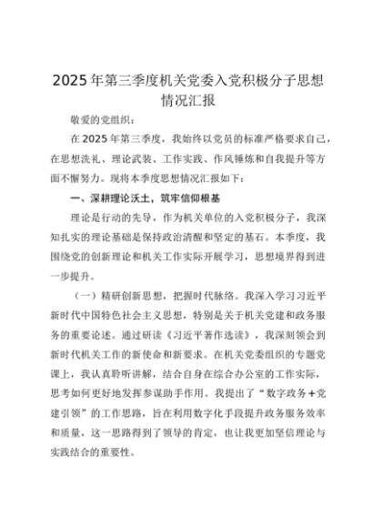【七哥公文】2025年:2025年第三季度机关党委入党积极分子思想情况汇报+更多免费公文+VX:QiGeGongWen2024