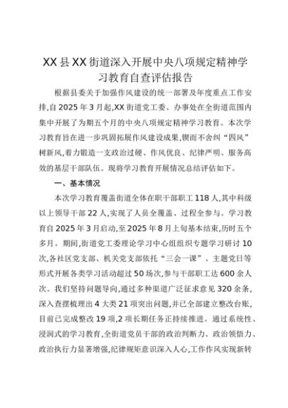 【七哥公文】2025年:XX县XX街道深入开展中央八项规定精神学习教育自查评估报告+更多免费公文+VX:QiGeGongWen2024