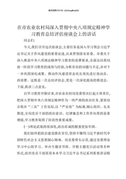 【七哥公文】2025年:【七哥公文】在市农业农村局深入贯彻中央八项规定精神学习教育总结评估座谈会上的讲话+更多免费公文+VX:QiGeGongWen2024+更多免费公文+VX:QiGeGongWen2024