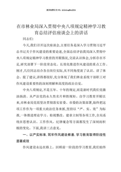 【七哥公文】2025年:【七哥公文】在市林业局深入贯彻中央八项规定精神学习教育总结评估座谈会上的讲话+更多免费公文+VX:QiGeGongWen2024+更多免费公文+VX:QiGeGongWen2024