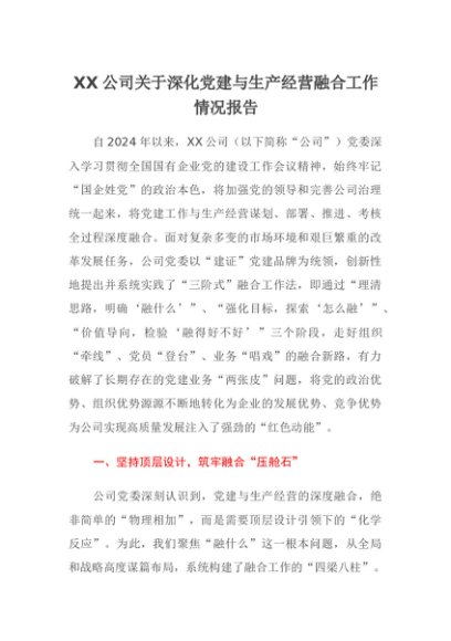 【七哥公文】2025年:XX公司关于深化党建与生产经营融合工作情况报告+更多免费公文+VX:QiGeGongWen2024