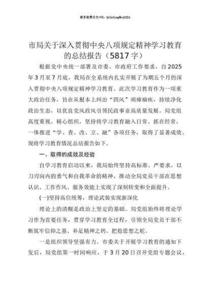 【七哥公文】2025年:【七哥公文】市局关于深入贯彻中央八项规定精神学习教育的总结报告(5817字)+更多免费公文+VX:QiGeGongWen2024+更多免费公文+VX:QiGeGongWen2024