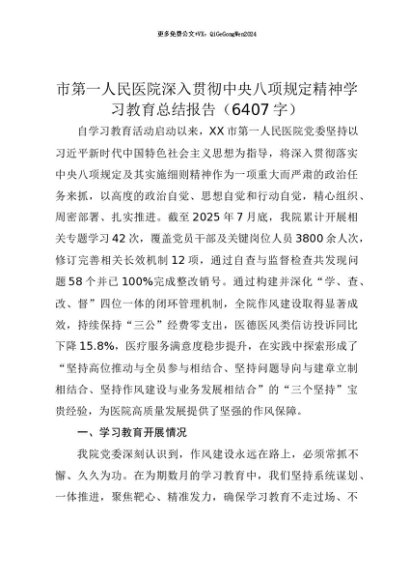 【七哥公文】2025年:【七哥公文】市第一人民医院深入贯彻中央八项规定精神学习教育总结报告(6407字)+更多免费公文+VX:QiGeGongWen2024+更多免费公文+VX:QiGeGongWen2024