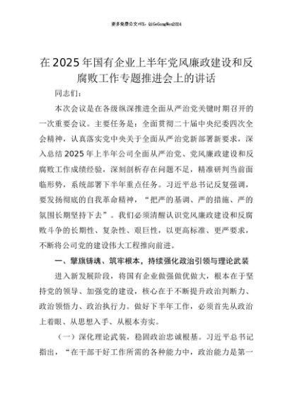 【七哥公文】2025年:【七哥公文】在2025年国有企业上半年党风廉政建设和反腐败工作专题推进会上的讲话+更多免费公文+VX:QiGeGongWen2024+更多免费公文+VX:QiGeGongWen2024
