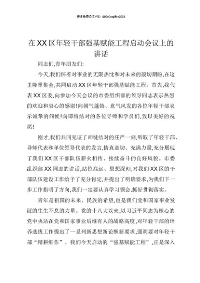 【七哥公文】2025年:【七哥公文】在XX区年轻干部强基赋能工程启动会议上的讲话+更多免费公文+VX:QiGeGongWen2024+更多免费公文+VX:QiGeGongWen2024