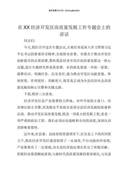 【七哥公文】2025年:【七哥公文】在XX经济开发区高质量发展工作专题会上的讲话+更多免费公文+VX:QiGeGongWen2024+更多免费公文+VX:QiGeGongWen2024