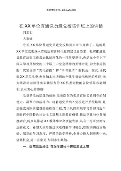 【七哥公文】2025年:【七哥公文】在XX单位普通党员进党校培训班上的讲话+更多免费公文+VX:QiGeGongWen2024+更多免费公文+VX:QiGeGongWen2024