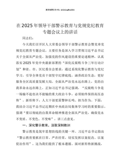 【七哥公文】2025年:【七哥公文】在2025年领导干部警示教育与党规党纪教育专题会议上的讲话+更多免费公文+VX:QiGeGongWen2024+更多免费公文+VX:QiGeGongWen2024