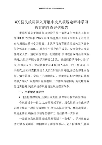 【七哥公文】2025年:【七哥公文】XX县民政局深入开展中央八项规定精神学习教育的自查评估报告+更多免费公文+VX:QiGeGongWen2024+更多免费公文+VX:QiGeGongWen2024