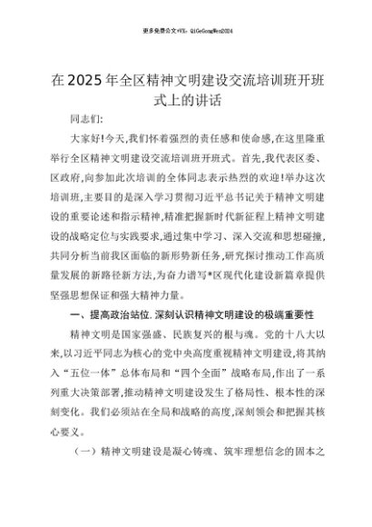 【七哥公文】2025年:【七哥公文】在2025年全区精神文明建设交流培训班开班式上的讲话+更多免费公文+VX:QiGeGongWen2024+更多免费公文+VX:QiGeGongWen2024