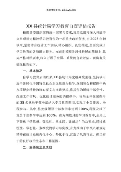 【七哥公文】2025年:【七哥公文】XX县统计局中央八项规定精神学习教育自查评估报告+更多免费公文+VX:QiGeGongWen2024+更多免费公文+VX:QiGeGongWen2024