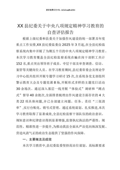【七哥公文】2025年:【七哥公文】XX县纪委关于中央八项规定精神学习教育的自查评估报告+更多免费公文+VX:QiGeGongWen2024+更多免费公文+VX:QiGeGongWen2024