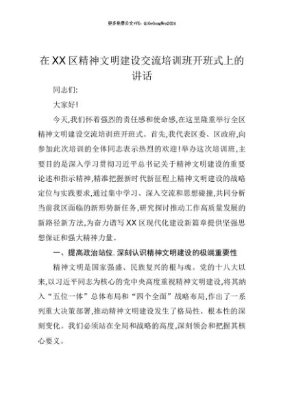 【七哥公文】2025年:【七哥公文】在XX区精神文明建设交流培训班开班式上的讲话+更多免费公文+VX:QiGeGongWen2024+更多免费公文+VX:QiGeGongWen2024