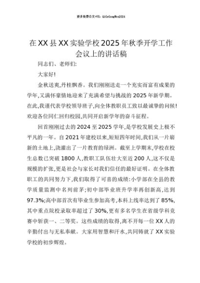 【七哥公文】2025年:【七哥公文】在XX县XX实验学校2025年秋季开学工作会议上的讲话稿+更多免费公文+VX:QiGeGongWen2024+更多免费公文+VX:QiGeGongWen2024