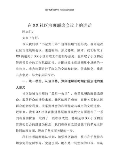 【七哥公文】2025年:【七哥公文】在XX社区治理联席会议上的讲话+更多免费公文+VX:QiGeGongWen2024+更多免费公文+VX:QiGeGongWen2024