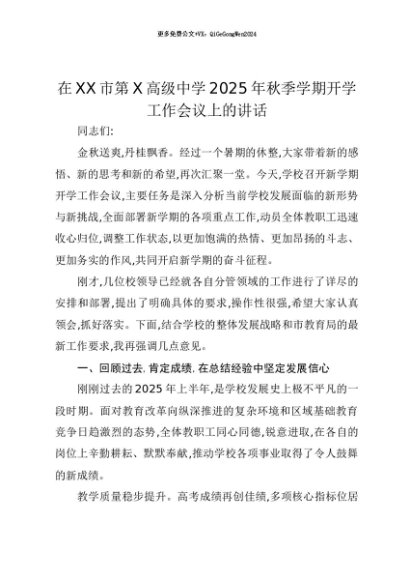 【七哥公文】2025年:【七哥公文】在XX市第X高级中学2025年秋季学期开学工作会议上的讲话+更多免费公文+VX:QiGeGongWen2024+更多免费公文+VX:QiGeGongWen2024