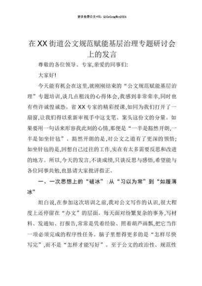 【七哥公文】2025年:【七哥公文】在XX街道公文规范赋能基层治理专题研讨会上的发言+更多免费公文+VX:QiGeGongWen2024+更多免费公文+VX:QiGeGongWen2024