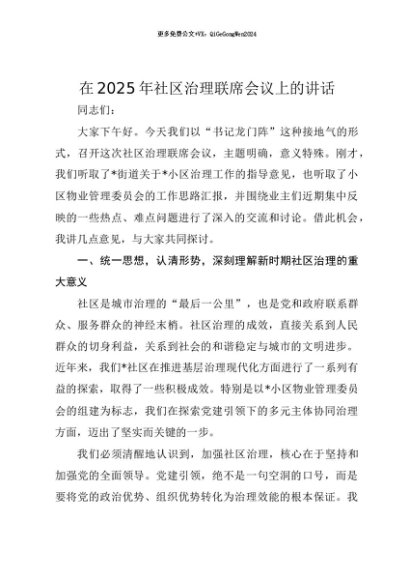 【七哥公文】2025年:【七哥公文】在2025年社区治理联席会议上的讲话+更多免费公文+VX:QiGeGongWen2024+更多免费公文+VX:QiGeGongWen2024