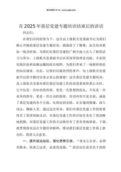 【七哥公文】2025年:【七哥公文】在2025年基层党建专题培训结束后的讲话+更多免费公文+VX:QiGeGongWen2024+更多免费公文+VX:QiGeGongWen2024