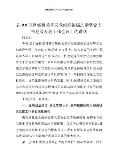 【七哥公文】2025年:【七哥公文】在XX区区级机关基层党组织换届选举暨党支部建设专题工作会议上的讲话+更多免费公文+VX:QiGeGongWen2024+更多免费公文+VX:QiGeGongWen2024