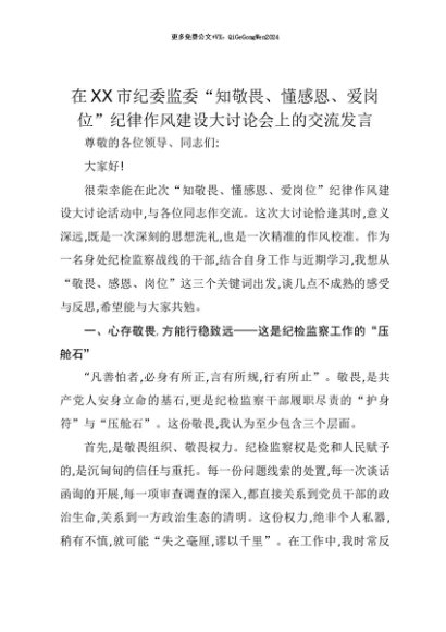 【七哥公文】2025年:【七哥公文】在XX市纪委监委“知敬畏、懂感恩、爱岗位”纪律作风建设大讨论会上的交流发言+更多免费公文+VX:QiGeGongWen2024+更多免费公文+VX:QiGeGongWen2024