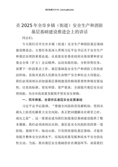 【七哥公文】2025年:【七哥公文】在2025年全市乡镇(街道)安全生产和消防基层基础建设推进会上的讲话+更多免费公文+VX:QiGeGongWen2024+更多免费公文+VX:QiGeGongWen2024