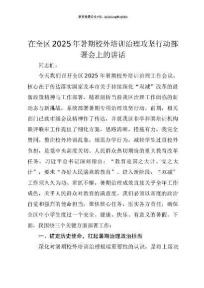 【七哥公文】2025年:【七哥公文】在全区2025年暑期校外培训治理攻坚行动部署会上的讲话+更多免费公文+VX:QiGeGongWen2024+更多免费公文+VX:QiGeGongWen2024