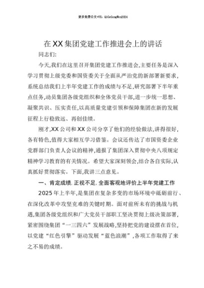 【七哥公文】2025年:【七哥公文】在XX集团党建工作推进会上的讲话+更多免费公文+VX:QiGeGongWen2024+更多免费公文+VX:QiGeGongWen2024