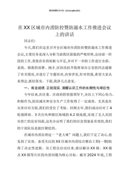 【七哥公文】2025年:【七哥公文】在XX区城市内涝防控暨防溺水工作推进会议上的讲话+更多免费公文+VX:QiGeGongWen2024+更多免费公文+VX:QiGeGongWen2024