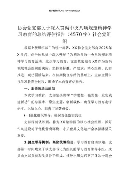【七哥公文】2025年:【七哥公文】协会党支部关于深入贯彻中央八项规定精神学习教育的总结评估报告(4570字)社会党组织+更多免费公文+VX:QiGeGongWen2024+更多免费公文+VX:QiGeGongWen2024
