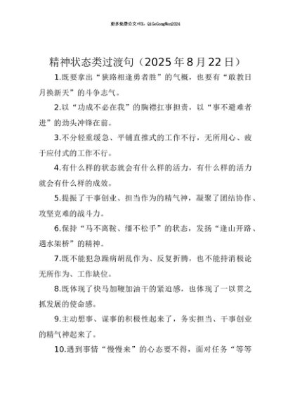 【七哥公文】2025年:【七哥公文】精神状态类过渡句(2025年8月22日)+更多免费公文+VX:QiGeGongWen2024+更多免费公文+VX:QiGeGongWen2024